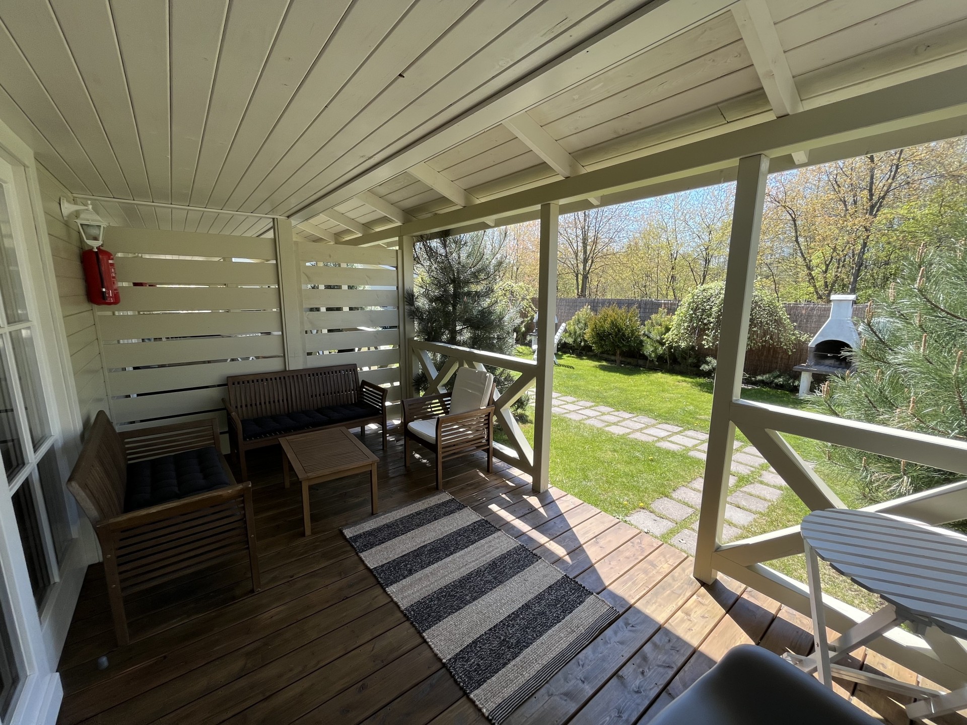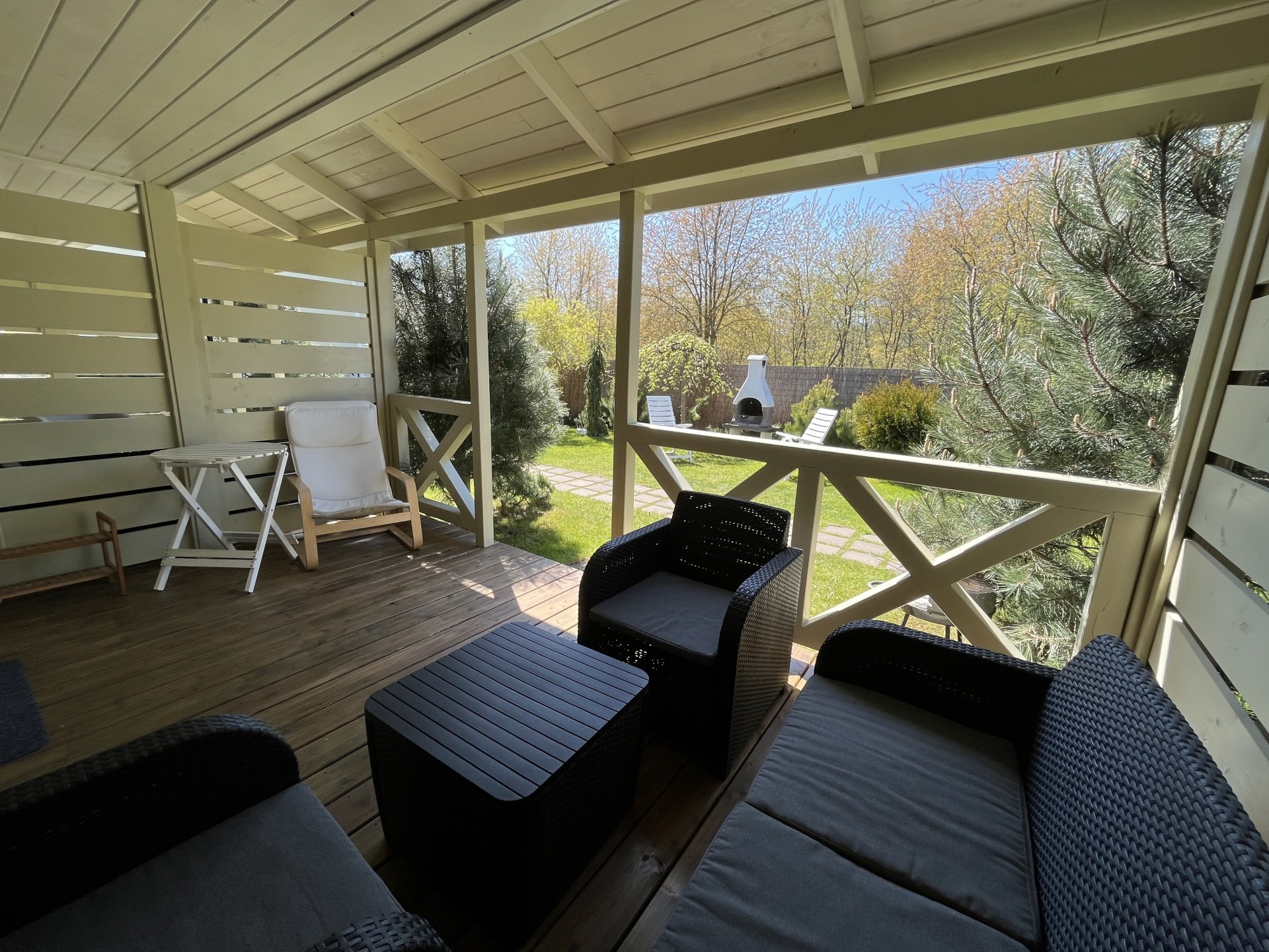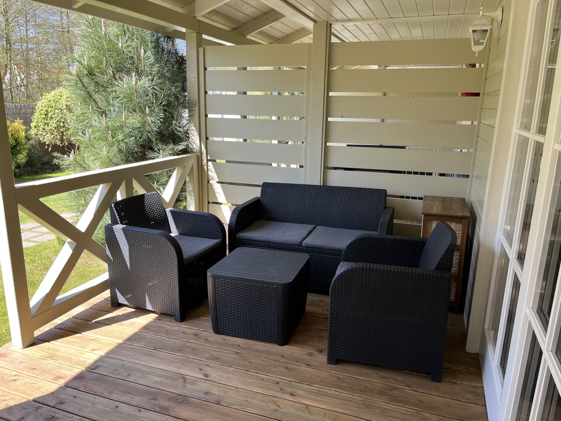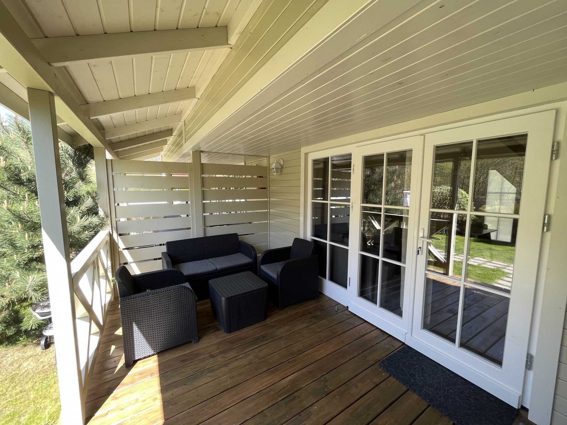 Wejście do domku poprzedza obszerny taras, idealnie nadający się do spożywania posiłków i relaksu.