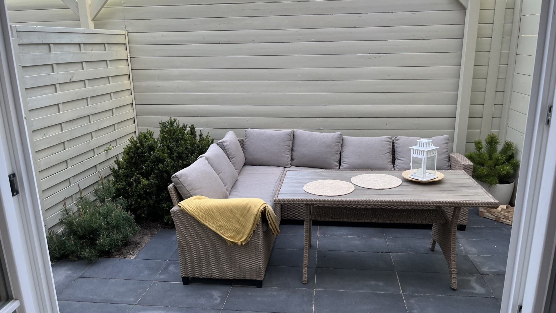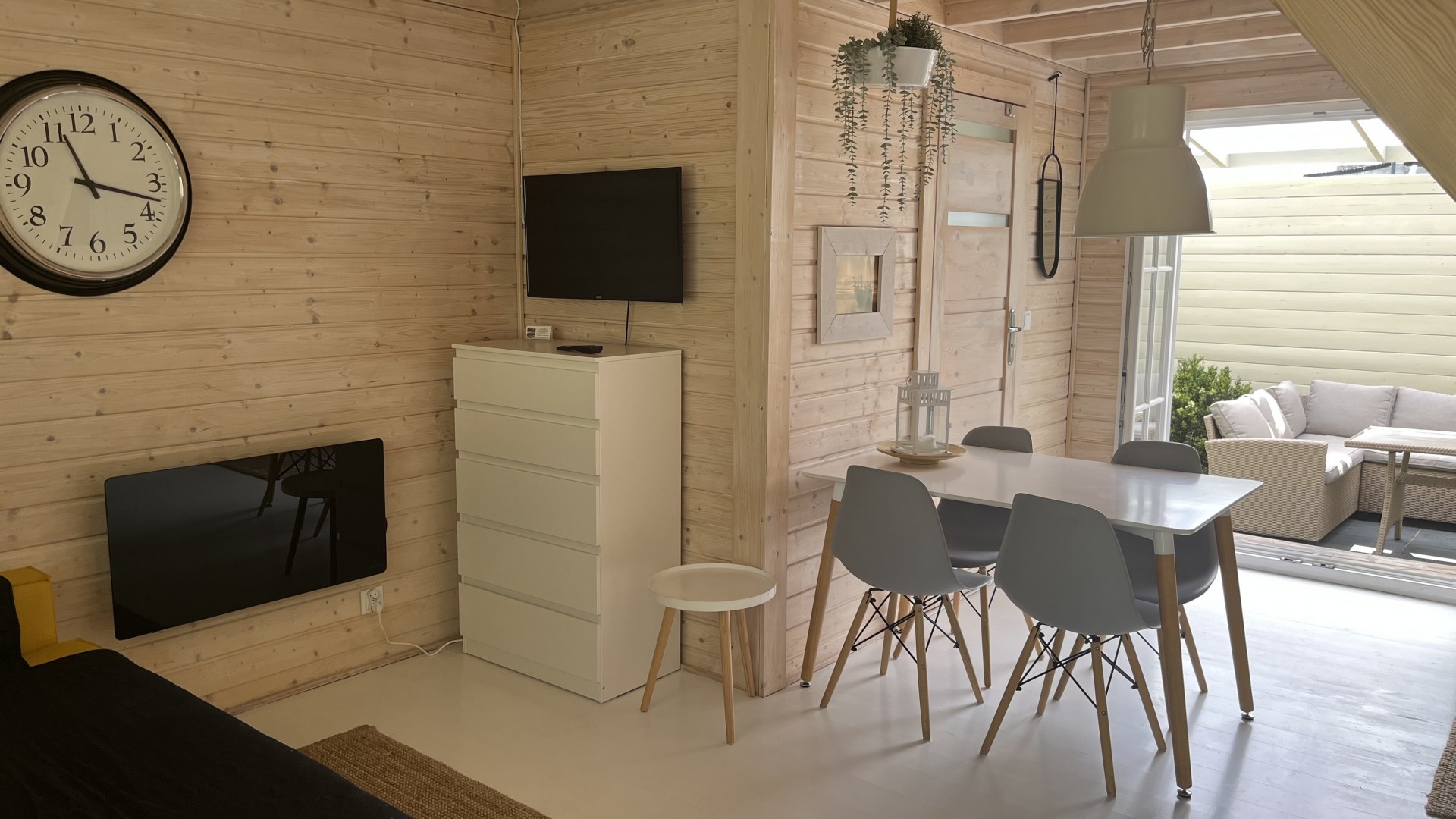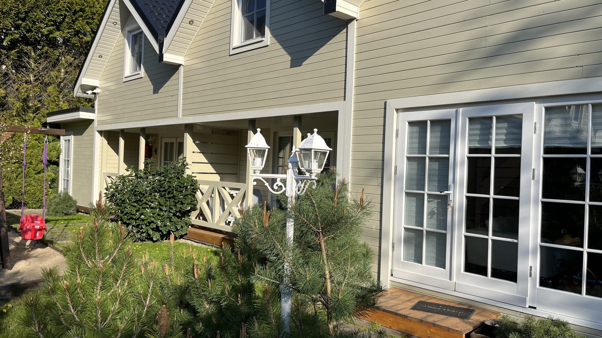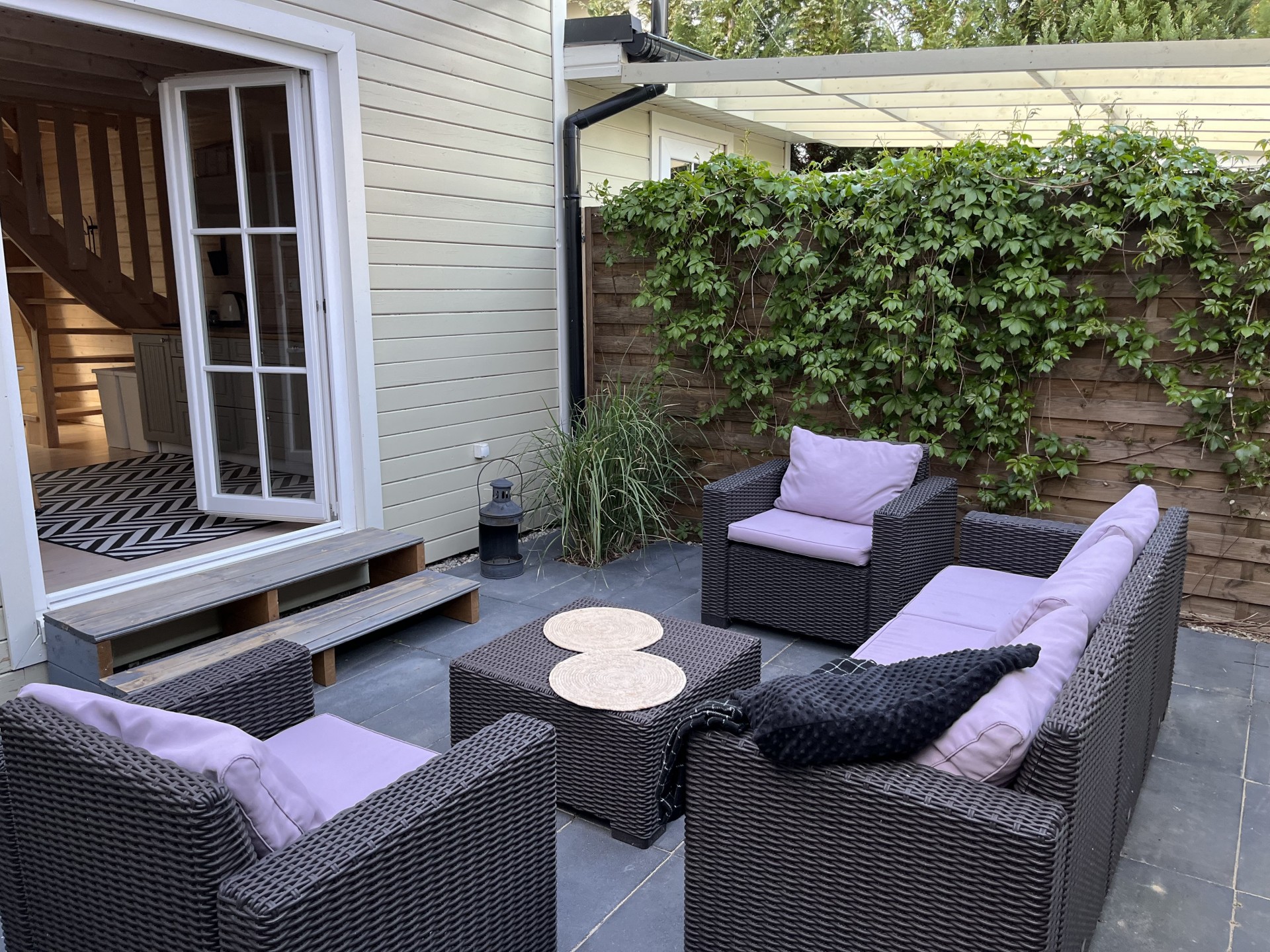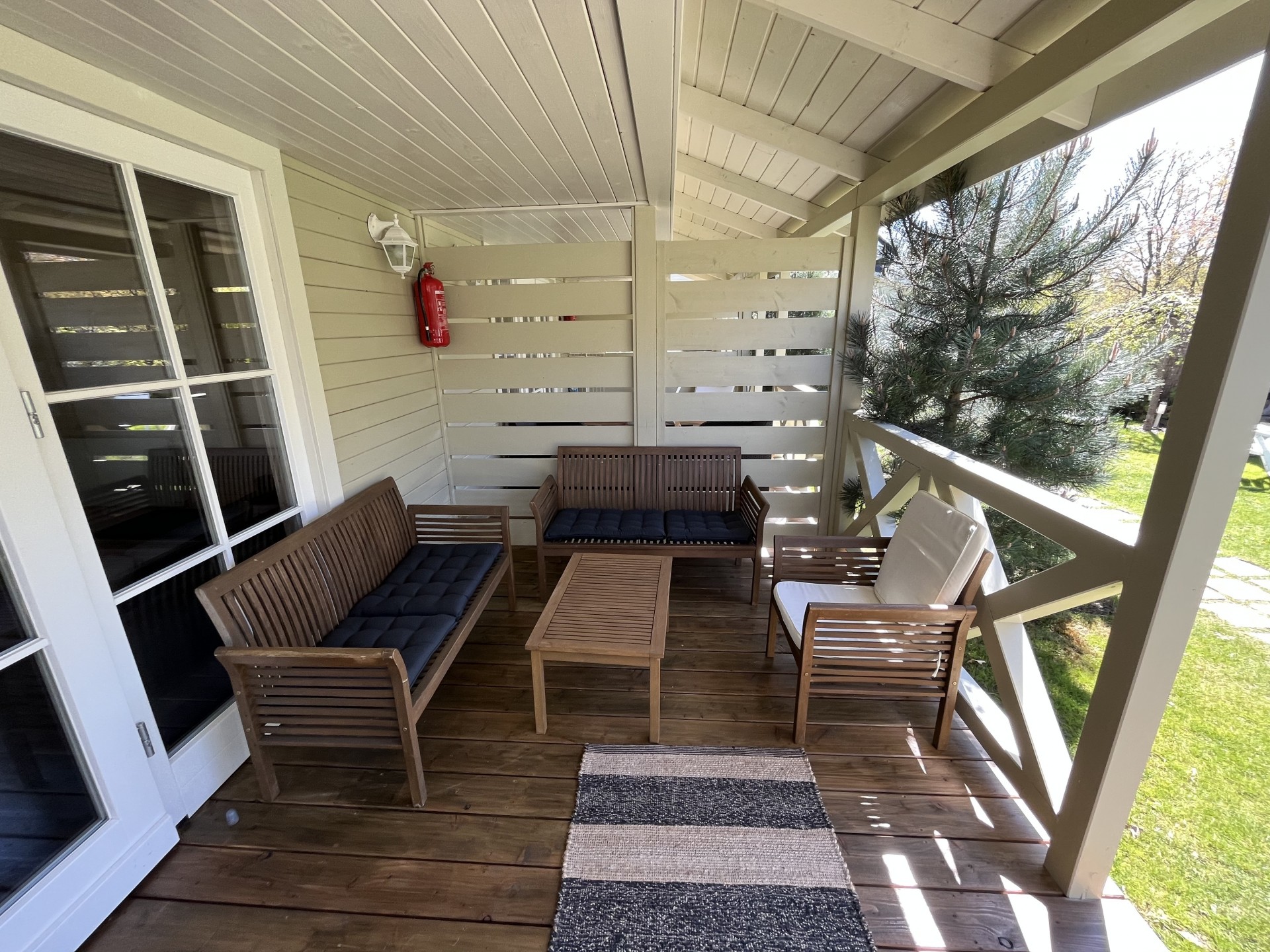 Wejście do domku poprzedza obszerny taras, idealnie nadający się do spożywania posiłków i relaksu.