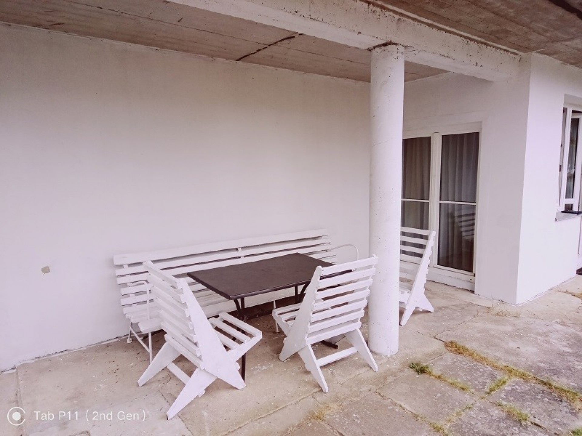 Pokoje na parterze posiadają oddzielne wejścia, przy pokojach znajdują się krzesła ogrodowe.